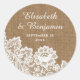 Personalised rustic burlap and lace wedding stickers featuring white floral lace on a burlap background. Easily personalise these rustic vintage stickers with your wedding details.