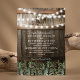 Rustic greenery wedding invitation featuring a country barn dark oak barrel background, twinkle string lights, your monogram, green botanical foliage, and a modern wedding template that is easy to personalise.