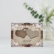 Rustic wedding RSVP postcard with meal selections featuring two burlap hearts on a burlap and wood background decorated with lace and string lights.