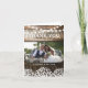 Rustic wedding thank you cards featuring a country barn oak barrel background, a photo of the married couple, twinkle string lights, baby's breath flowers, and your wedding details.