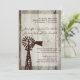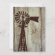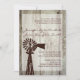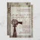 A simple rustic country wedding invitation with a distressed barn wood print background with a farm windmill at the bottom of the invitation. The back of the invitation also has the windmill design. These invitations are perfect for an outdoor country style wedding, farm wedding, rural wedding, or cowboy wedding.