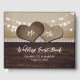 Romantic rustic wedding guest book featuring two burlap hearts on a barn wood, burlap and lace background adorned with string lights.