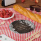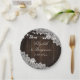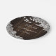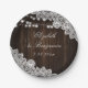 Elegant and romantic rustic wedding party paper plates inspired by barn wood, white floral lace and string lights.