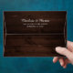 Custom rustic country wood wedding envelopes with a return address on a dark brown barn wood background.