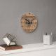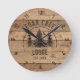 Rustic wood plank and forest pine trees clock personalised with your custom text (family name or vacation cabin or home rental property name) and year established. The sample is shown in 8-inch round size--choose 10.75 inch or square on the ordering page. ASSISTANCE: For help with design modification or personalisation, colour change, resizing, transferring the design to another product or if you would like coordinating items, contact the designer BEFORE ORDERING via the Zazzle Chat MESSAGE tab below or email makeitaboutyoustore@gmail.com.