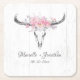 Add a touch of elegance to your wedding parties with these custom boho themed paper coasters. This rustic design template features a hand drawn cow skull with a head dress of blush pink watercolor roses on a background of white weathered wood. Below are your names and wedding date to personalise. Designed by artist ©Susan Coffey.