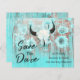 Rustic cow skull boho sunflowers western teal brown wedding budget save the date announcement flat card. Rodeo cowboy bull skull with horns country floral texture. Barn wood vintage bohemian farmhouse cowgirl style design. Image copyright Marg Seregelyi Photography.
