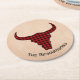 Rustic cabin themed pulp board paper coasters done in a craft paper look with graphics of a red and black buffalo plaid cow skull silhouette. Personalise the black arched text to suit your needs.