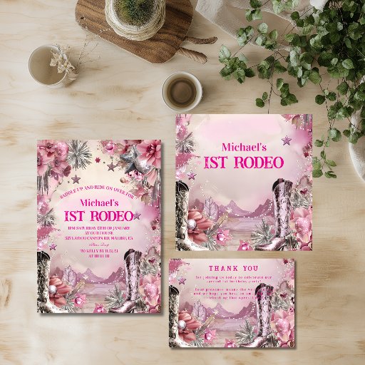 Celebrate your little cowboy’s first rodeo with this rustic western design! Featuring cowboy boots, hats, cacti, and red wildflowers, it sets the perfect scene for a country-style birthday party. Ideal for barn, farm, or outdoor celebrations with a vintage western touch.