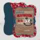 Rustic cowboy theme baby shower invitation card. Featuring red bandanna print with denim-look and a rocking horse. Colours are red, blue, browns, and white.