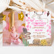 Rustic little cowgirl first rodeo western cow 1st birthday photo invitation featuring a rustic desert theme, with boho cow skull, cowboy lasso, pink country bunter flags, cowboy hat, rustic wooden wheel, hay stack, sunflowers bouquet, green desert cactus, wooden sign with saloon and horses ( the text can be edited) and wild west pink cow pattern. Saddle up and join us for a birthday party!