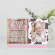 Cowgirl western themed birthday invitation card with pink gingham, rustic wood plank background, check print and party bunting.