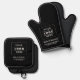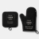 Modern black and white Custom branded Oven Mitt & Pot Holder Set features a business logo design centred on the front and framed by custom text that can be personalised with the name of the company, location, slogan, website, or other info. Black background and white text colours can be modified.