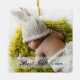 This is a lovely ornament, and great that you personalise the back with details of birthday, weight, etc.. My only tiny disappointment is the "My First" doesn't stand out very well on the background. More than happy with the printing of the photo and the writing on the back.