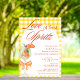 Rustic Elegant Cute Chic Love At First Spritz Bridal Shower Invitation - Featuring a watercolor Aperol spritz with an orange slice garnish, adorned with a coquette orange bow. The invitation has a rustic, gingham plaid yellow background and a white arch frame. The words "Love at first Spritz" are written in a mixture of refined script calligraphy and elegant block dark burnt orange text. Edit this bridal shower invitation template with your own event details. Also available as an instant digital download, easily send via text, email or social media.