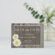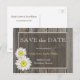 Rustic save the date postcards with white daisies on a weathered barn wood background.