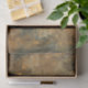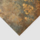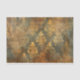 This is an ornate, decorative pattern in shades of gold, turquoise, and rust. The design features intricate, symmetrical damask or arabesque motifs that resemble stylised acanthus leaves, scrolls, and floral elements arranged in vertical columns. The patterns have a distressed, weathered appearance with faded and worn areas, revealing turquoise and rust underneath the gold top layer. This aged patina effect gives the design an antique or vintage feel.