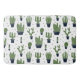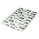 A bath mat with a rustic western flavour. Designed with a bunch of cute green cactuses in a repeating pattern. Specifically, green coloured prickly cactus, in all kinds of shapes and sizes, each sitting in its own dark blue flower pot. Little decorative triangles in between them. Whimsical fun illustration.