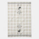 Customise your kitchen with this cute personalised towel featuring your family name or house name and year established in rich charcoal grey lettering accented with a deer illustration on a tonal plaid background.