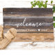 Rustic welcome wood doormat personalised with family name and established year.