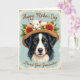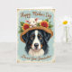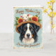 On the front of the card a tricolor dog with black, russet, and white markings looks straight ahead with warm amber eyes, giving the scene a loyal, affectionate feel ❤️. A light straw hat sits on its head, adding a cozy, country touch to the portrait. Resting on the hat is a small white lamb with soft pink ears, leaning in as if keeping the dog sweet company. The lamb’s tiny dark hooves touch the brim, creating a gentle, friendly closeness between the two animals. Bright yellow sunflowers and deep red roses nestle around the hat like a bouquet, with green leaves filling out the arrangement 🌼. The background is a pale sky-blue wash that keeps everything calm and airy. A flowing message in dark ink sits along the top edge, with a second line of matching text placed near the bottom. A worn, ornate border frames the image in muted tones, with lightly distressed corners and decorative flourishes.
