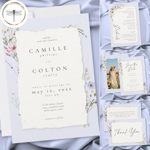 This dusty blue floral wedding invitation features a soft pastel background, delicate wildflowers, and a handmade torn edge paper look. Perfect for romantic garden weddings, it offers an elegant, modern style with timeless charm for couples seeking a refined wedding design. Created by Simply Farmhouse Press.