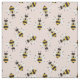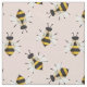 A pattern of yellow and black striped, illustrated, rustic bees swarm across this soft pink fabric.