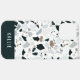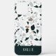 Rustic earthy green and blue terrazzo stone pattern, iPhone case with name. Coordinating deep green colour block tab with coordinating text line in white.