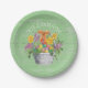 This personalised floral Easter themed paper plates features a rustic design of a white basket of yellow and purple spring flowers and Easter eggs in shades of yellow, purple, green and turquoise with your family name in white typography on a faux green weathered wood background. Designed by world renowned artist ©Tim Coffey.