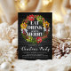 Invite your guests to eat, drink and be merry with this personalised elegant rustic christmas party invitation. Designed with a black wooden background, a traditional christmas wreath made of pine cones, fir tree, ribbons, winter berries and poinsettia flowers. For extra sparkle string fairy lights are entangled in the wreath creating that magical xmas feeling!