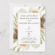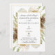 Both clean and decorative, this rustic wedding invitation features a nice pine bough with pine cones frame on a white background background with gold trim