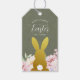 Elegant Easter personalised gift tag featuring a gold bunny with fluffy tail, lovely pastel watercolor flowers, and stylish simulated olive green kraft paper background. Perfect for Easter party favour or Easter gifts. Customise with short greeting and name.