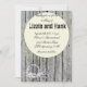 Rustic grey weathered planks of wood is the backdrop of this charming wedding invite. A decorative wreath of flowers, hearts and lace decorate the bottom of card and a round decorative sphere with leaves and flowers are centre of card with all the information. Country chic at its finest.