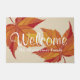 Elegan taupe and red fall leaves "Welcome" doormat with personalised family name in white.