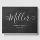 This stylish guest book is made with a dark grey kraft paper background and your family name printed in an elegant swirly script font.