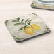 Beautiful Ripe Lemons on an elegant, rustic looking coasters. A unique European etched branch of full green leaves with one whole lemon and one juicy lemon half on a neutral grey stone textured background.