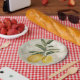 Beautiful Ripe Lemons on an elegant, rustic looking paper plate. A unique European etched branch of full green leaves with one whole lemon and one juicy lemon half on a neutral grey stone textured background.