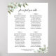 This beautiful 4 table wedding seating chart includes table assignments for 40 guests with 10 seats per table. The rustic hand painted watercolor design features sprigs of sage green eucalyptus leaves & greenery on a classic white background. The lacy script calligraphy title reads: Please find your table, and the names of the couple and wedding date appear at the bottom. The elegant bohemian chic design is a wonderful way to help your guests find their seats while adding class and style to your reception.