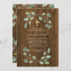 This rustic and trendy Baptism or Christening invitation features simple green watercolor eucalyptus leaves and foliage with a faux gold cross. The background is made to look like rustic brown wood.