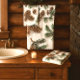 Enhance a cabin-style bathroom with this bath towel set, featuring a rustic evergreen forest design. The pattern includes pinecones on a white background and is suitable for both the Christmas season and winter months.