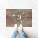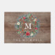 Beautiful watercolor pinecone evergreen wreath doormat personalised with your initial and family name set on a rustic faux wood background.