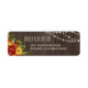 Rustic and romantic return address label with printed wood grain, a drawing of a sunflower and red rose arrangement with berries, wheat, and green leaves, and rows of string light hanging in one corner and glowing softly. Add your name and address!