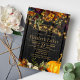 Beautiful rusty orange and dark burgundy autumn fall flowers and pumpkin borders with strings of golden twinkle lights over a dark brown barn wood background making a charming elegant birthday party invitation with a trendy handwriting gold typography script. +++++++++ Easy to personalise with your details! Suitable for traditional rustic | country | farmhouse | outdoor backyard family and friends gatherings.
