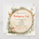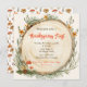 Thanksgiving Feast invitation with rustic wooden carved background. Autumn foliage with wildflowers and cute mushrooms. Easy to personalise.
