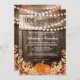 Rustic autumn housewarming party invitations featuring a country barn oak wood barrel background, twinkle string lights, fall leaves, a harvest pumpkin, and a home sweet home party template that is easy to personalise.