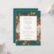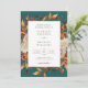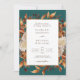 Teal Terracotta Fall Leaves Wedding Invitation. This elegant wedding invitation features beautiful hand-painted watercolor burnt orange, copper, terracotta leaves, cream and beige dahlias, and beautiful rust and brown roses on a teal background; perfect for an autumn wedding! The back of the invite has a beautiful branch of leaves with the bride and groom's monogram. Find matching items in the Teal Autumn Romance Wedding Collection.