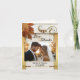 A romantic wedding Thank You note card featuring your own wedding picture framed by rustic white weathered wood and colorful fall leaves on gold panels with gold metallic swirls. On the inside and back is space for more photos. This photo Thank You card is perfect for an autumn wedding.