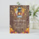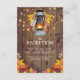 Rustic country wedding reception cards featuring a wooden barn background, autumn leaves, a candle lit lantern, string twinkle lights and a modern wedding template.
