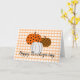 An adorable trio of pumpkins filled in with rustic patterns over an orange gingham plaid and the words Happy Thanksgiving underneath. The inside reads “Wishing you the very best of the holiday season”.