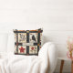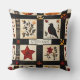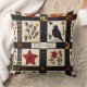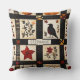 This throw pillow showcases a rustic quilt-inspired pattern arranged in squares and rectangular blocks with warm autumn motifs. The patchwork features pumpkins, a black bird with a reddish breast, hearts, red stars, and floral branches in earthy shades of red, orange, and brown. Geometric accents like plaid and cross-stitch textures add to the handmade feel. With a cosy farmhouse aesthetic in black, cream, and fall tones, this pattern is perfect for autumn décor, primitive country style, and rustic harvest season charm.